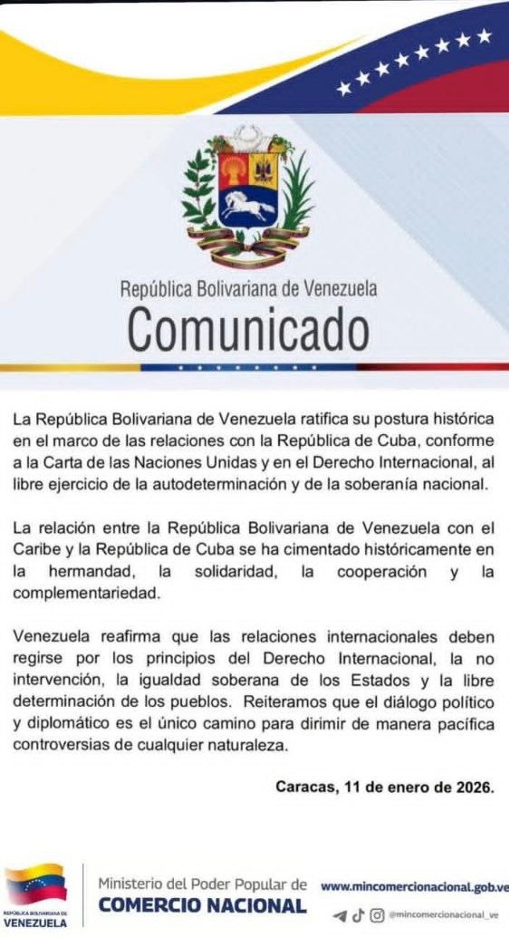 “Reiteramos que el diálogo político y diplomático es el único camino para dirimir de manera pacífica controversias de cualquier naturaleza”, agregó el texto fechado en Caracas este domingo, 11 de enero de 2026.